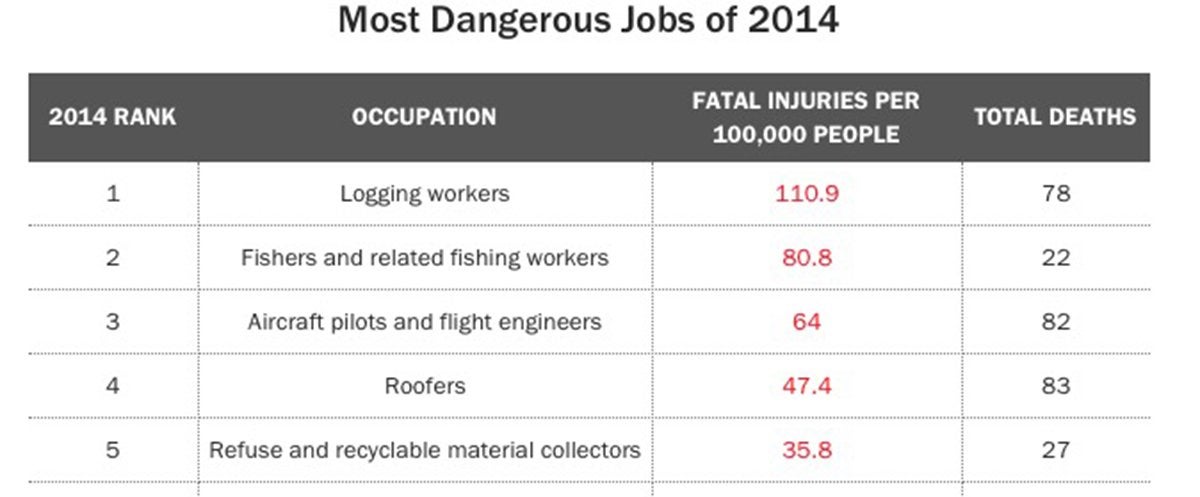 If you click through the links, you’ll discover that the data was developed by the Census of Fatal Occupational Injuries.I phoned the census agency to get a sense of how this data is collected, but the answer is, by aviation accident investigation standards, rather murky. The source data trickles in through something called the Current Population Survey and as the linked document explains, this has been used in two ways—one is risk based on hours data and other is employment data, in other words death per 100,000 workers engaged in the occupation being examined.