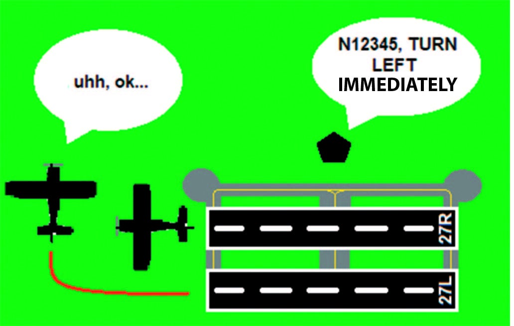 Imagine you’re the PIC, departing from Runway 27L. Tower: “N12345, I’ll call your right turn north east. Runway 27L, cleared for takeoff.” You respond appropriately. Maybe on a subconscious level, you realize that there are departures off of Runway 27R as well. You rotate and climb, and Tower tells you, “N12345, make it a left turnout; left turnout approved.”