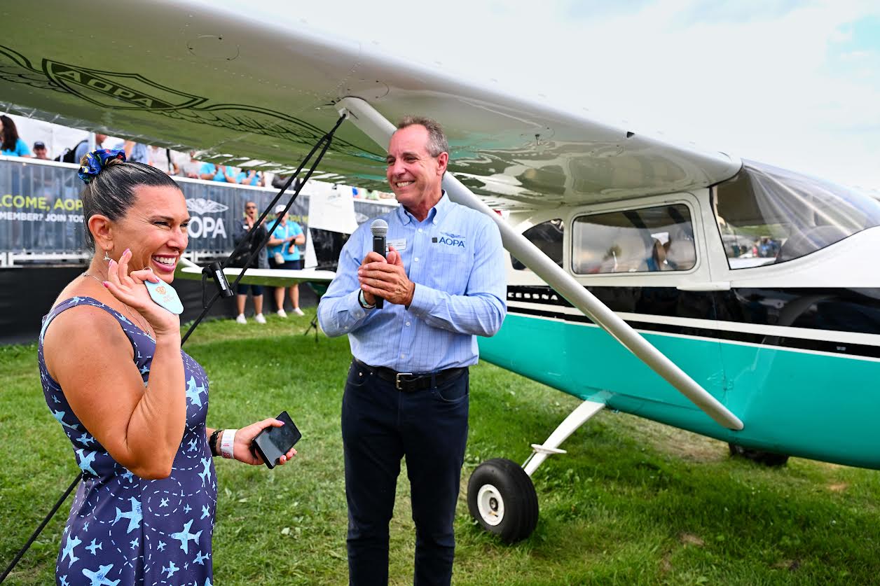 The Aircraft Owners and Pilots Association (AOPA) unveiled the winner of its 2025 aircraft sweepstakes Wednesday night at EAA AirVenture, presenting a restored 1958 Cessna 182A to California pilot Jennifer Hortman.