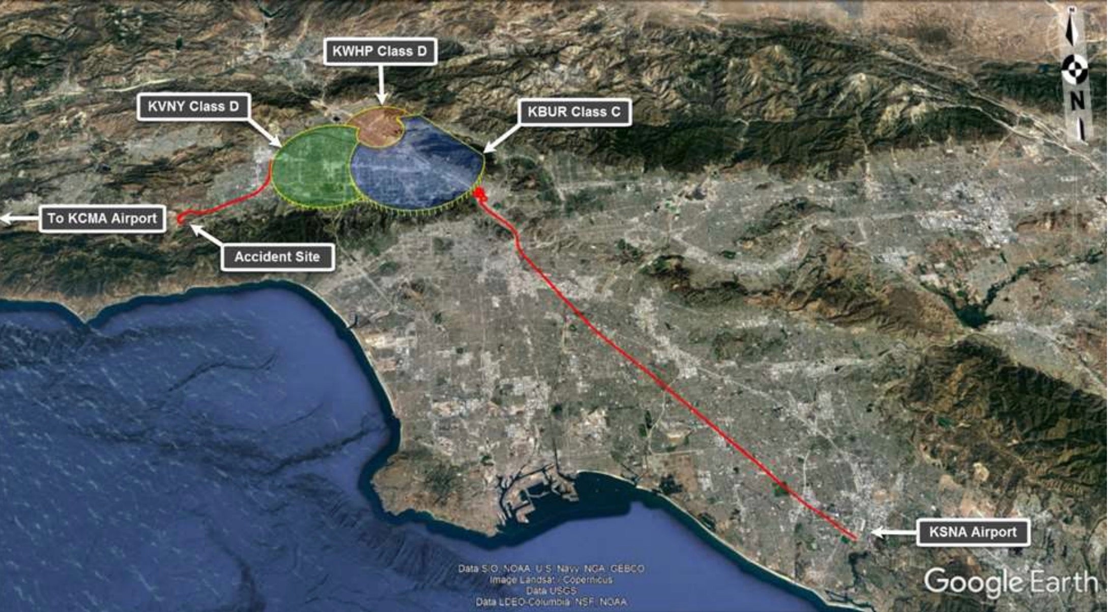 Although the wreckage was significantly destroyed by fire, the NTSB said it found no evidence of powerplant, rotor or control failure. The impact crater was 24 feet by 15 feet in diameter and was 2 feet deep. Just prior to the crash, radar and ADS-B data indicated the S-76 was following Highway 101, a major freeway through the terrain leading toward Camarillo. The aircraft climbed to a peak altitude of 2300 feet—about 1500 feet above the highway, which runs through a canyon—before entering a descending left turn that eventually reached a vertical speed of 4000 feet per minute and a forward speed of 160 knots.