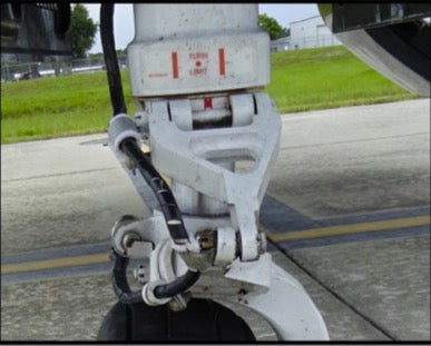 The operator of the aircraft told investigators he was aware of the towing limits on his airplane and he had never seen it improperly towed, but he also said he didn’t know how many times it may have been towed without his knowledge. The nosegear is attached to the steering horn with a vertical shaft and three bolts on a flange. There are lines painted on the gear showing the safe turn limits when using a tow bar, which can act as a lever to deliver enough torque to shear the attachment bolts if the turn is too sharp. The NTSB deduced at least one of those bolts had to be attached after takeoff on the accident flight because the gear won’t stow unless the wheel is turned 90 degrees during retraction and one or more failed on landing.